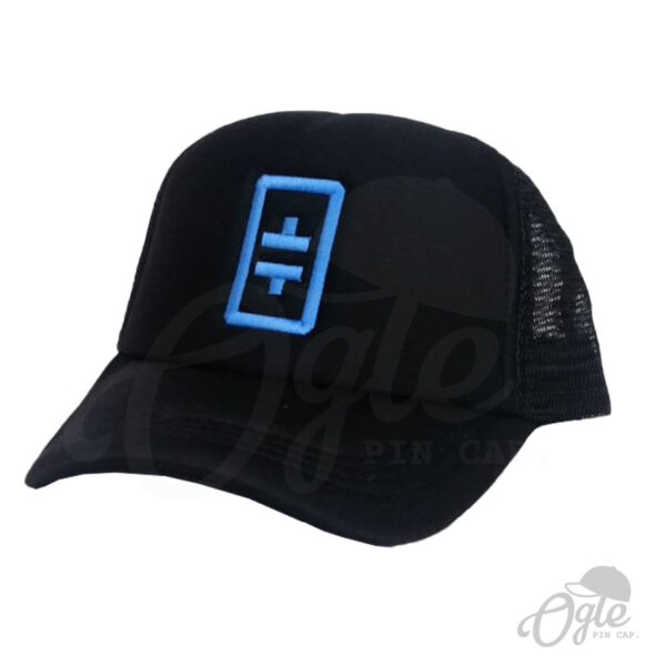 หมวกปักโลโก้ ด้วยไหมปักสีฟ้า โดยใช้หมวกตาข่ายสสีดำทั้งใบ ระบายอากาศได้ดี ด้านหลังหมวกปรับกระชับด้วยกระดุม 2 แถว หมวกมีน้ำหนักเบา สวมใส่สบาย
